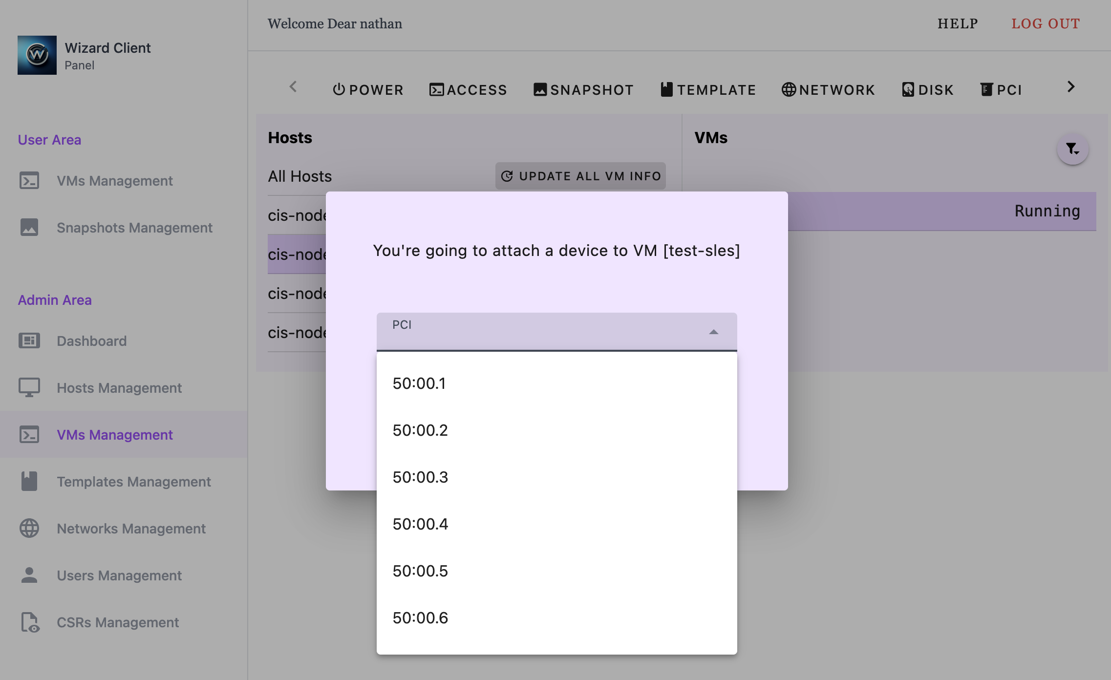 wizard-client -c vm-hostdev-attach -v test-sles -pci 50:00.6
