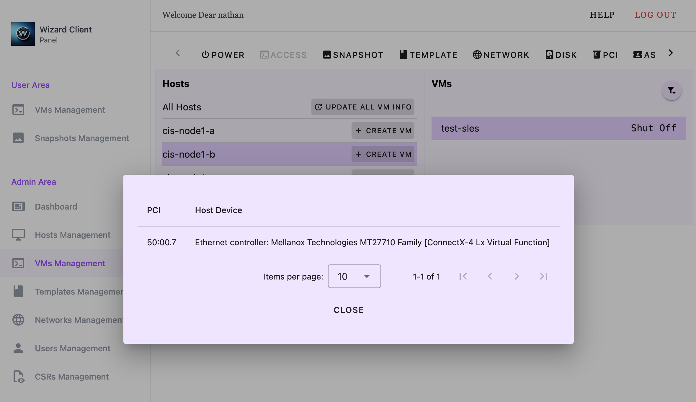 Using the Wizard Client WebUI, we can check which PCI devices are allowed for a host by navigating to Hosts Management and selecting the host. The Allowed PCI section lists the available devices.